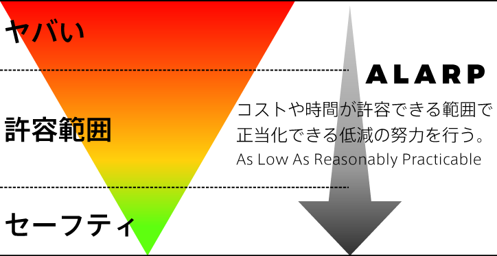 ALARPの核となる考え方は「合理的に実行可能な方法の選択」にあり、リスクを制御するために必要なトラブル・時間・お金に対するリスクを比較検討すること。